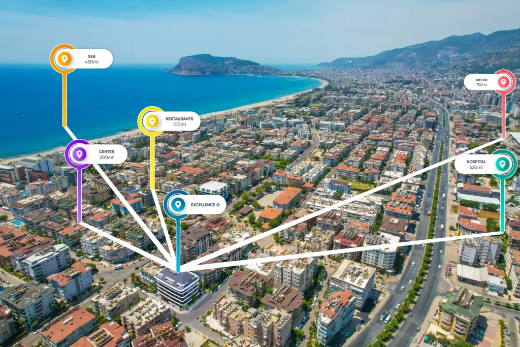 Excellence Q, Oba’nın en dinamik noktasında, plaja sadece 450 metre mesafede konumlanan premium bir yaşam projesidir. 28 daireden oluşan kompleks, 44 m²’den 198 m²’ye kadar uzanan geniş daire seçenekleri ve penthouse’larıyla farklı ihtiyaçlara cevap verir. Isıtmalı havuz, sinema salonu, masaj odası, spa ve kafeterya gibi zengin sosyal donatılarıyla resort yaşamını günlük hayata taşır. Carrefour’a 100 metre, tüm sosyal tesislere yürüme mesafesinde olan Excellence Q, Oba’da kaliteli yaşamın yeni adresidir.